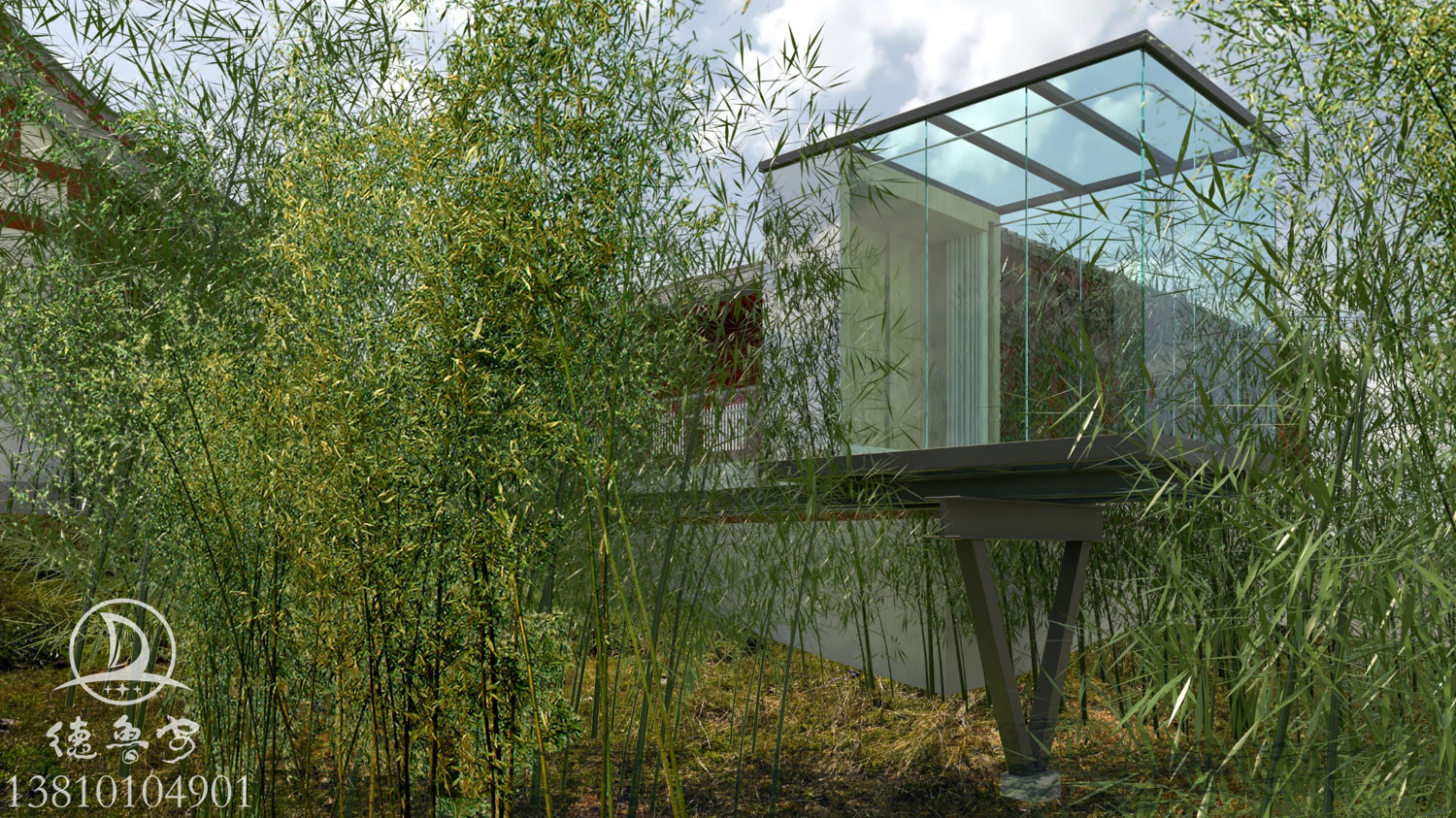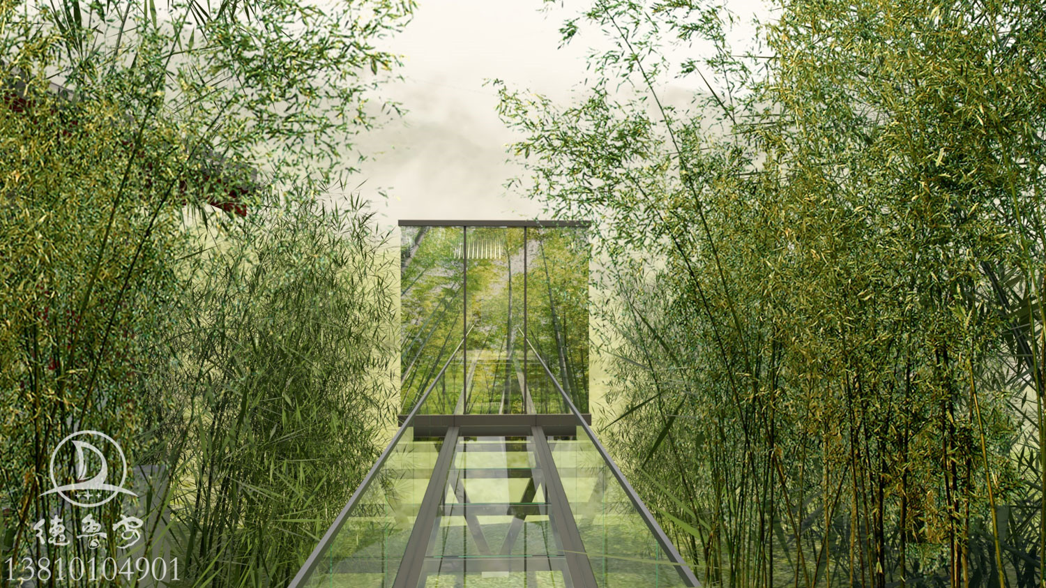 冥想室位于山坡竹海上,冥想室主要为使用者提供一个安静舒适的思考空间,同时使用者能在最大程度上将周边自然景观一览无余。设计的核心思路围绕“隐、透、小”。进入冥想室的小栈道使用玻璃材质,借助玻璃材质的通透性,很好的保证了整个竹海在视觉上的完整性,穿越竹海时仿佛放空于自然之中。进入冥想室的外墙使用的是镜面不锈钢,这种材质既具有一定的耐脏能力,同时通过镜面的反射能很好地让房子隐于茂密的竹海之中。房隐于山,人隐于房,心隐于世。